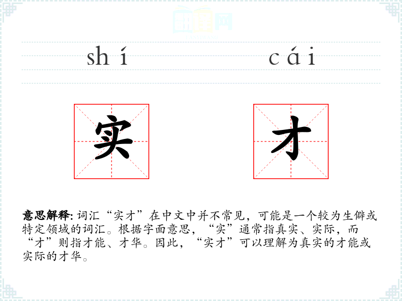 词汇“实才”在中文中并不常见,可能是一个较为生僻或特定领域的词汇。根据字面意思,“实”通常指真实、实际,而“才”则指才能、才华。因此,“实才”可以理解为真实的才能或实际的才华。