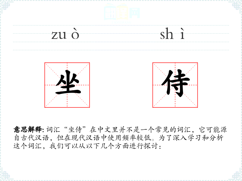 词汇“坐侍”在中文里并不是一个常见的词汇,它可能源自古代汉语,但在现代汉语中使用频率较低。为了深入学*和分析这个词汇,我们可以从以下几个方面进行探讨: