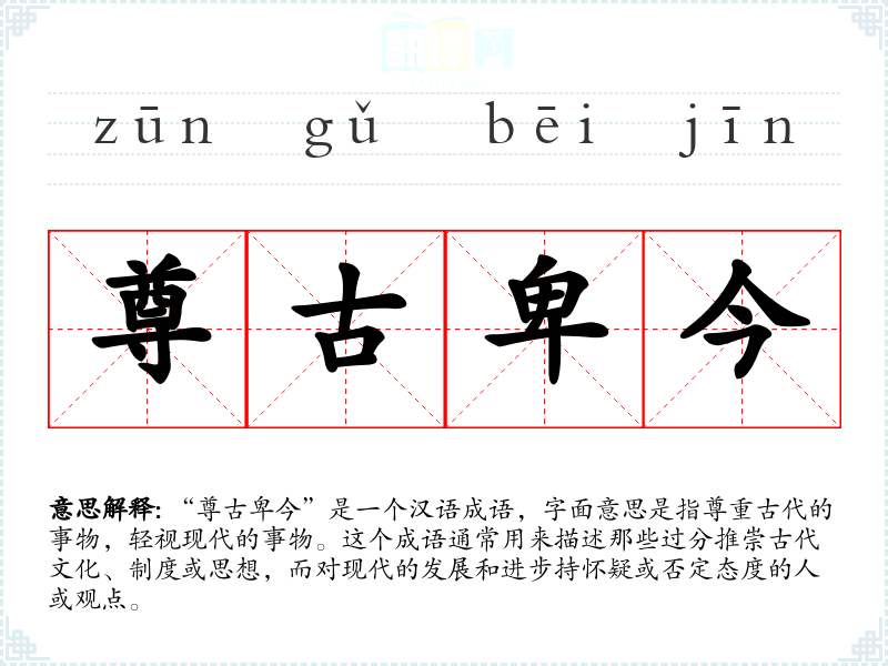 “尊古卑今”是一个汉语成语,字面意思是指尊重古代的事物,轻视现代的事物。这个成语通常用来描述那些过分推崇古代文化、制度或思想,而对现代的发展和进步持怀疑或否定态度的人或观点。