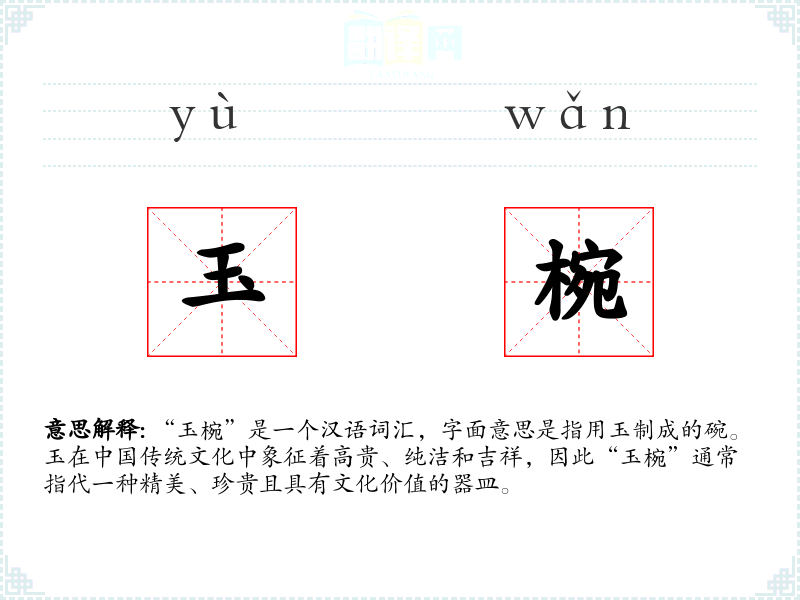“玉椀”一词源自古代汉语,其中“玉”指玉石,“椀”是“碗”的古字。随着时间的推移,“椀”逐渐被“碗”所替代,但“玉椀”作为一个特定的文化词汇保留了下来。