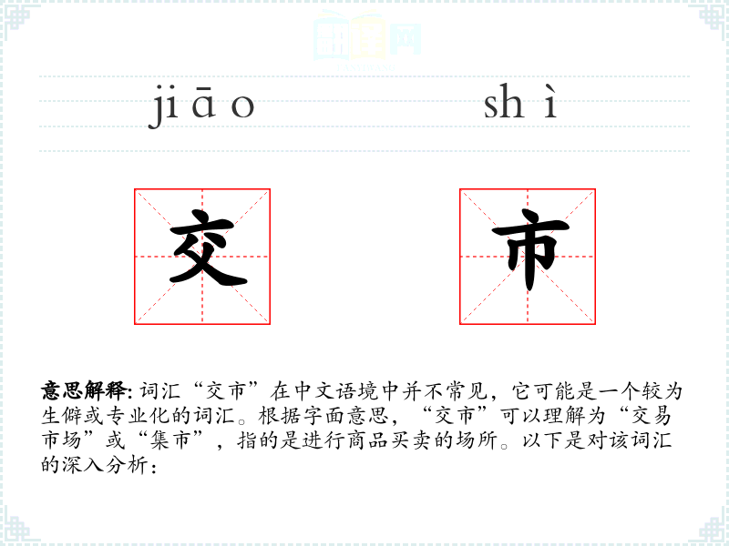 词汇“交市”在中文语境中并不常见,它可能是一个较为生僻或专业化的词汇。根据字面意思,“交市”可以理解为“交易市场”或“集市”,指的是进行商品买卖的场所。以下是对该词汇的深入分析: