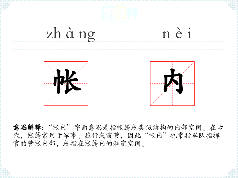 “帐内”字面意思是指帐篷或类似结构的内部空间。在古代,帐篷常用于军事、旅行或露营,因此“帐内”也常指军队指挥官的营帐内部,或指在帐篷内的私密空间。