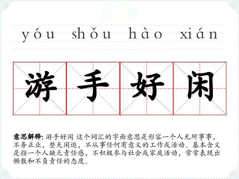 游手好闲 这个词汇的字面意思是形容一个人无所事事,不务正业,整天闲逛,不从事任何有意义的工作或活动。基本含义是指一个人缺乏责任感,不积极参与社会或家庭活动,常常表现出懒散和不负责任的态度。