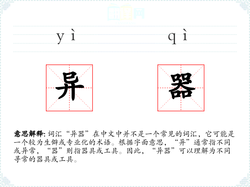 词汇“异器”在中文中并不是一个常见的词汇,它可能是一个较为生僻或专业化的术语。根据字面意思,“异”通常指不同或异常,“器”则指器具或工具。因此,“异器”可以理解为不同寻常的器具或工具。