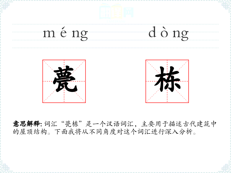 词汇“甍栋”是一个汉语词汇,主要用于描述古代建筑中的屋顶结构。下面我将从不同角度对这个词汇进行深入分析。
