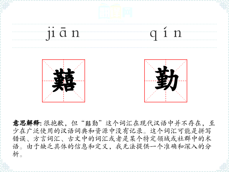 很抱歉,但“囏勤”这个词汇在现代汉语中并不存在,至少在广泛使用的汉语词典和资源中没有记录。这个词汇可能是拼写错误、方言词汇、古文中的词汇或者是某个特定领域或社群中的术语。由于缺乏具体的信息和定义,我无法提供一个准确和深入的分析。