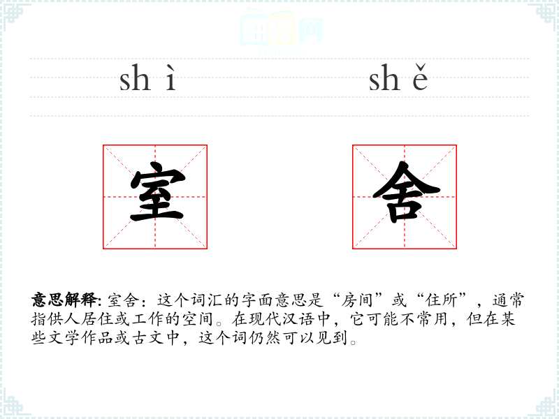 室舍:这个词汇的字面意思是“房间”或“住所”,通常指供人居住或工作的空间。在现代汉语中,它可能不常用,但在某些文学作品或古文中,这个词仍然可以见到。