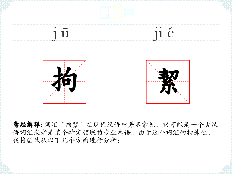 词汇“拘絜”在现代汉语中并不常见,它可能是一个古汉语词汇或者是某个特定领域的专业术语。由于这个词汇的特殊性,我将尝试从以下几个方面进行分析: