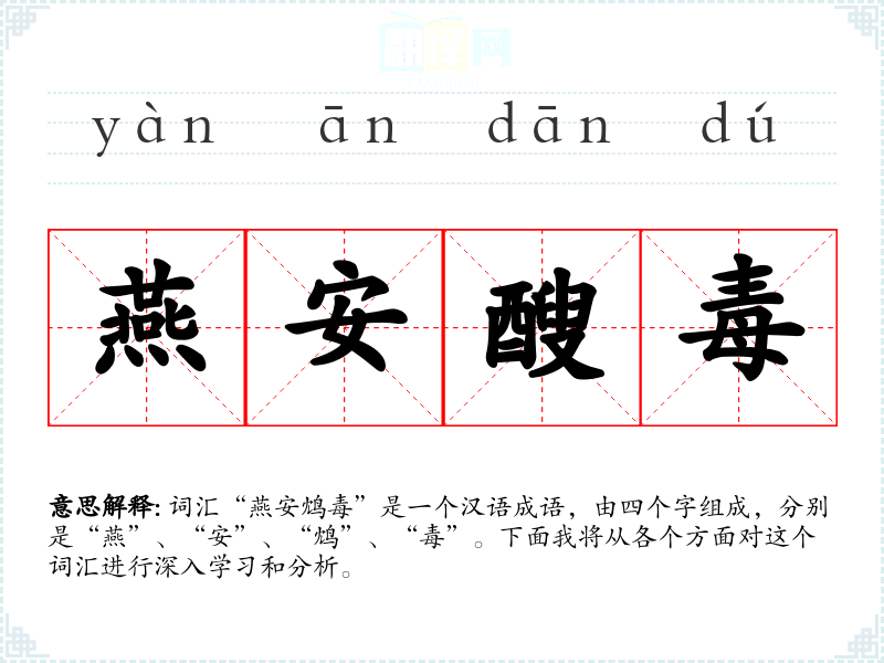 词汇“燕安鸩毒”是一个汉语成语,由四个字组成,分别是“燕”、“安”、“鸩”、“毒”。下面我将从各个方面对这个词汇进行深入学*和分析。