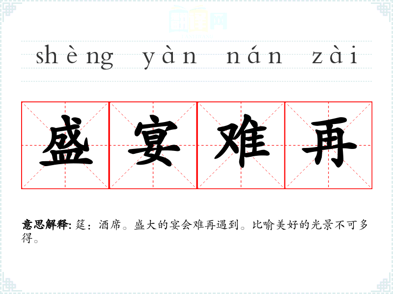 筵:酒席。盛大的宴会难再遇到。比喻美好的光景不可多得。