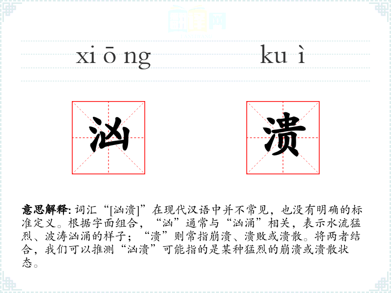 词汇“[汹溃]”在现代汉语中并不常见,也没有明确的标准定义。根据字面组合,“汹”通常与“汹涌”相关,表示水流猛烈、波涛汹涌的样子;“溃”则常指崩溃、溃败或溃散。将两者结合,我们可以推测“汹溃”可能指的是某种猛烈的崩溃或溃散状态。