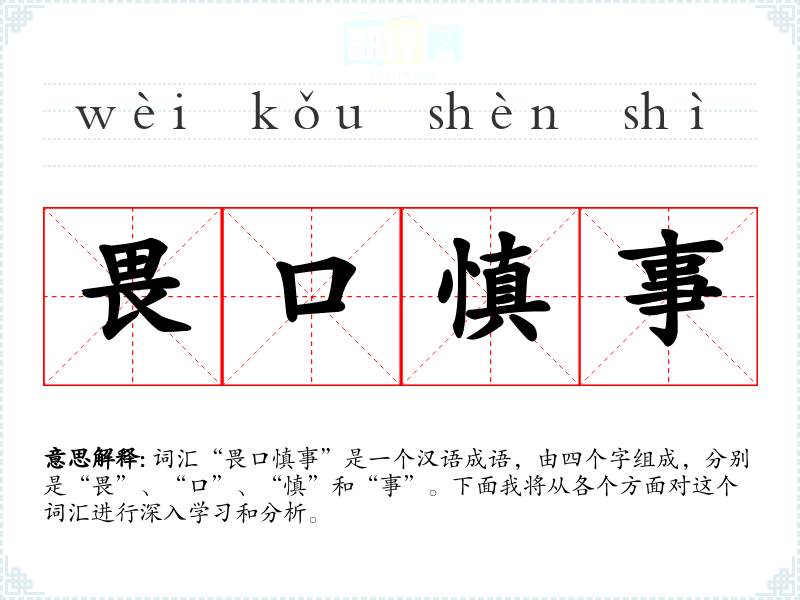 词汇“畏口慎事”是一个汉语成语,由四个字组成,分别是“畏”、“口”、“慎”和“事”。下面我将从各个方面对这个词汇进行深入学*和分析。