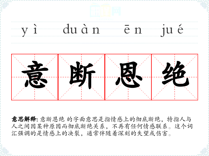 意断恩绝 的字面意思是指情感上的彻底断绝,特指人与人之间因某种原因而彻底断绝关系,不再有任何情感联系。这个词汇强调的是情感上的决裂,通常伴随着深刻的失望或伤害。