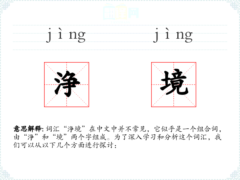 词汇“浄境”在中文中并不常见,它似乎是一个组合词,由“浄”和“境”两个字组成。为了深入学*和分析这个词汇,我们可以从以下几个方面进行探讨: