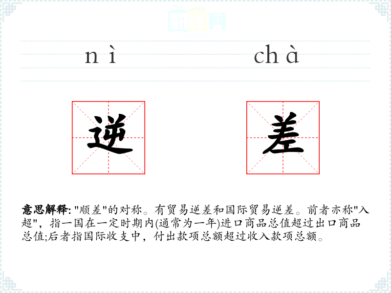 "顺差"的对称。有贸易逆差和国际贸易逆差。前者亦称"入超",指一国在一定时期内(通常为一年)进口商品总值超过出口商品总值;后者指国际收支中,付出款项总额超过收入款项总额。