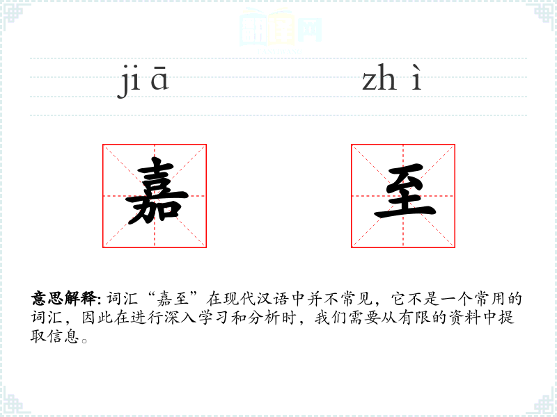 词汇“嘉至”在现代汉语中并不常见,它不是一个常用的词汇,因此在进行深入学*和分析时,我们需要从有限的资料中提取信息。