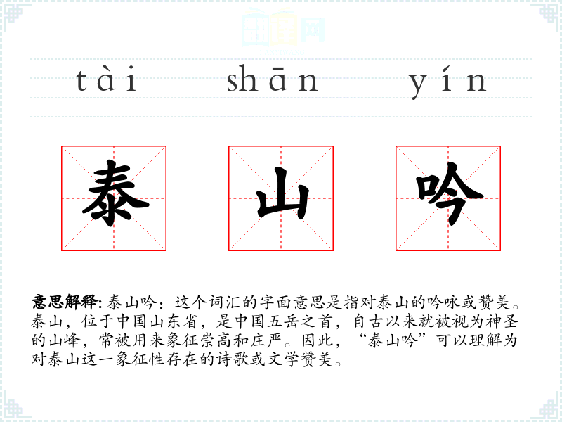 “泰山吟”这个词汇不仅是对泰山的赞美,也是对传统文化的一种体现。在学*这个词汇时,可以更深入地了解*的历史和文化,以及文学创作中的象征手法。这个词汇在语言学和表达中具有一定的价值,尤其是在理解和欣赏古典文学时。