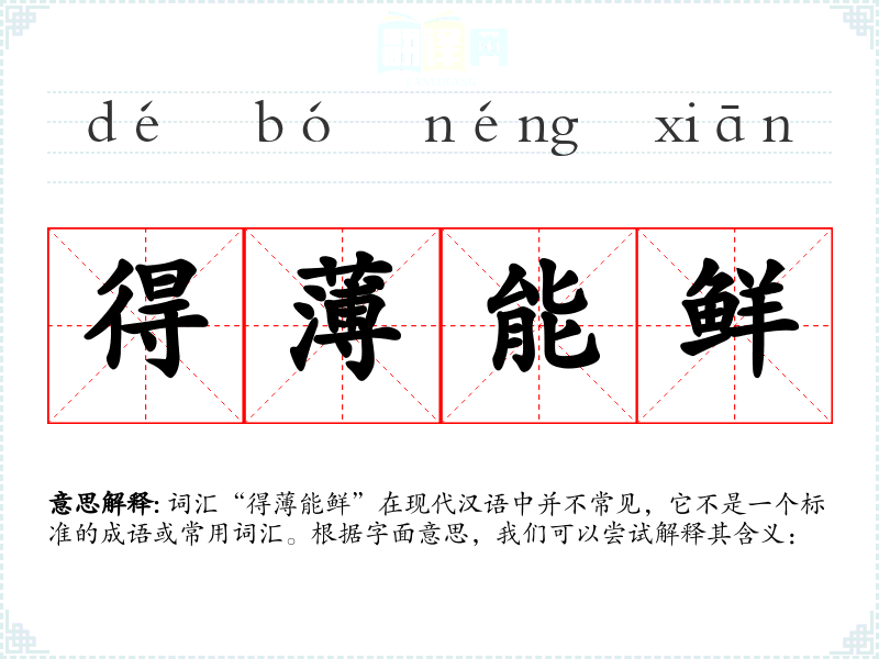 词汇“得*能鲜”在现代汉语中并不常见,它不是一个标准的成语或常用词汇。根据字面意思,我们可以尝试解释其含义: