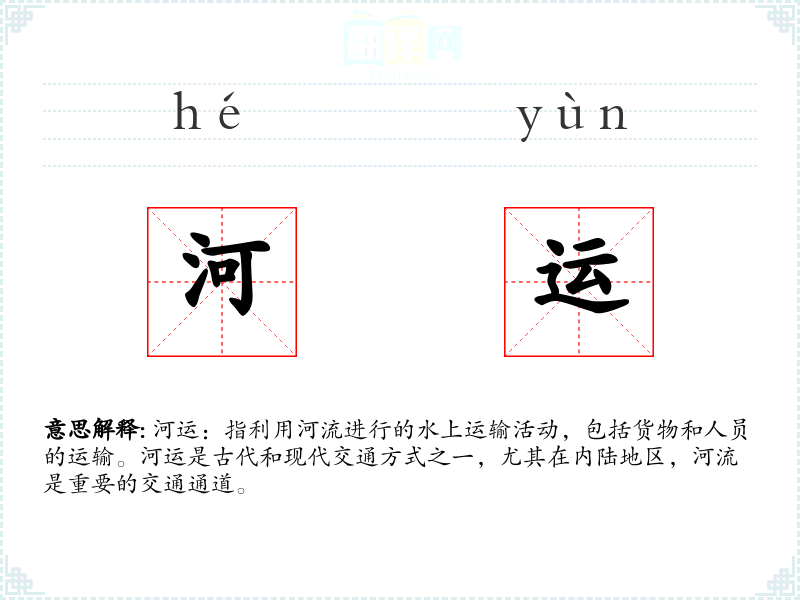 河运:指利用河流进行的水上运输活动,包括货物和人员的运输。河运是古代和现代交通方式之一,尤其在内陆地区,河流是重要的交通通道。