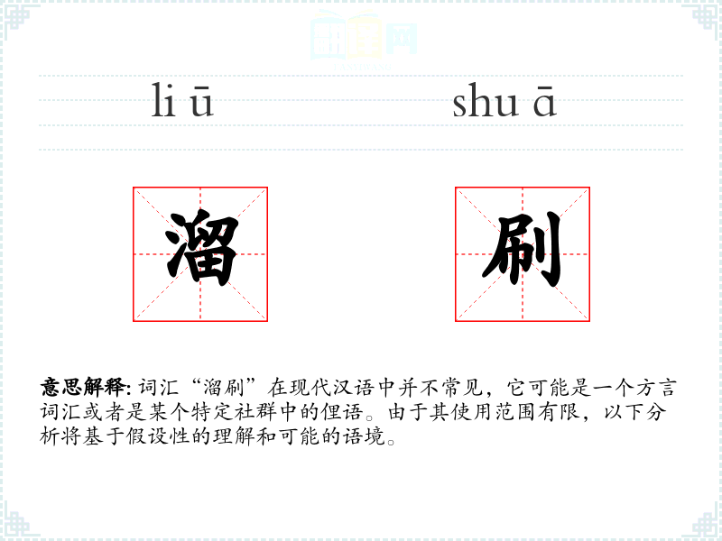 词汇“溜刷”在现代汉语中并不常见,它可能是一个方言词汇或者是某个特定社群中的俚语。由于其使用范围有限,以下分析将基于假设性的理解和可能的语境。