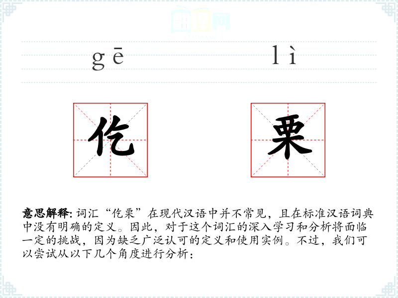词汇“仡栗”在现代汉语中并不常见,且在标准汉语词典中没有明确的定义。因此,对于这个词汇的深入学习和分析将面临一定的挑战,因为缺乏广泛认可的定义和使用实例。不过,我们可以尝试从以下几个角度进行分析: