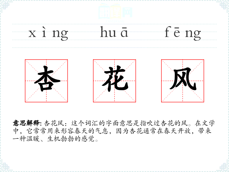 杏花风:这个词汇的字面意思是指吹过杏花的风。在文学中,它常常用来形容春天的气息,因为杏花通常在春天开放,带来一种温暖、生机勃勃的感觉。