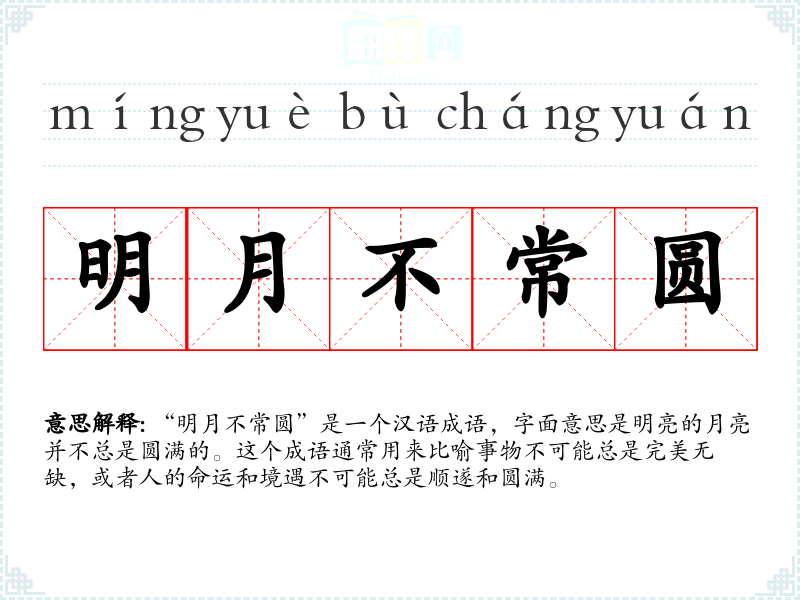 “明月不常圆”是一个汉语成语,字面意思是明亮的月亮并不总是圆满的。这个成语通常用来比喻事物不可能总是完美无缺,或者人的命运和境遇不可能总是顺遂和圆满。