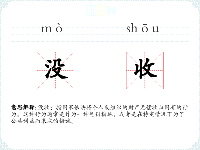 在不同语言中,没收的对应词汇可能有所不同,但其核心意义——财产的无偿转移——是普遍存在的。例如,英语中的“confiscate”和法语中的“confisquer”都表达了类似的概念。