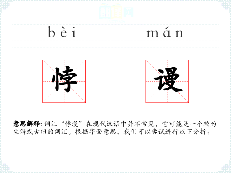 词汇“悖漫”在现代汉语中并不常见,它可能是一个较为生僻或古旧的词汇。根据字面意思,我们可以尝试进行以下分析: