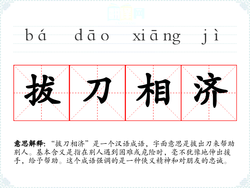 “拔刀相济”这个成语源自**古代的武侠文化,特别是在描述侠客行为的文学作品中。随着时间的推移,这个成语的含义逐渐扩展,不仅仅局限于武侠领域,而是被广泛应用于各种需要帮助和支持的场合。