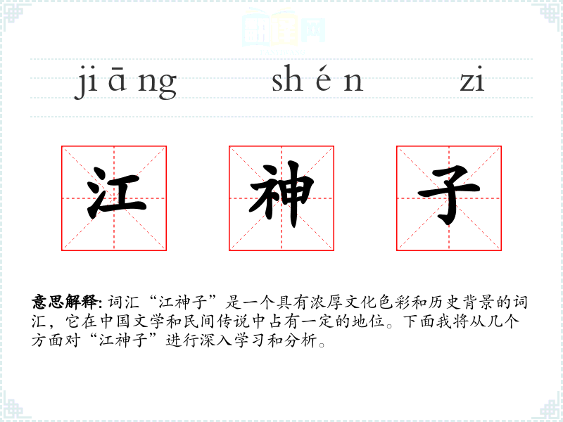 词汇“江神子”是一个具有浓厚文化色彩和历史背景的词汇,它在*文学和民间传说中占有一定的地位。下面我将从几个方面对“江神子”进行深入学和分析。