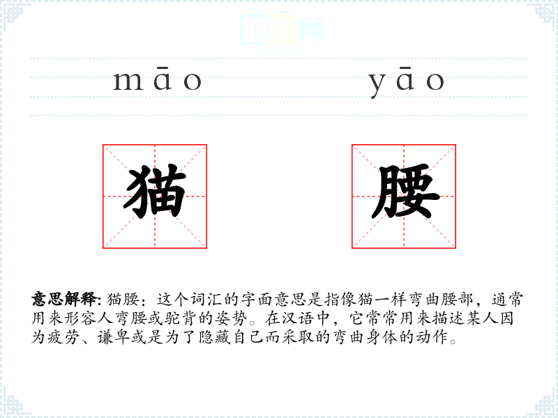 猫腰:这个词汇的字面意思是指像猫一样弯曲腰部,通常用来形容人弯腰或驼背的姿势。在汉语中,它常常用来描述某人因为疲劳、谦卑或是为了隐藏自己而采取的弯曲身体的动作。