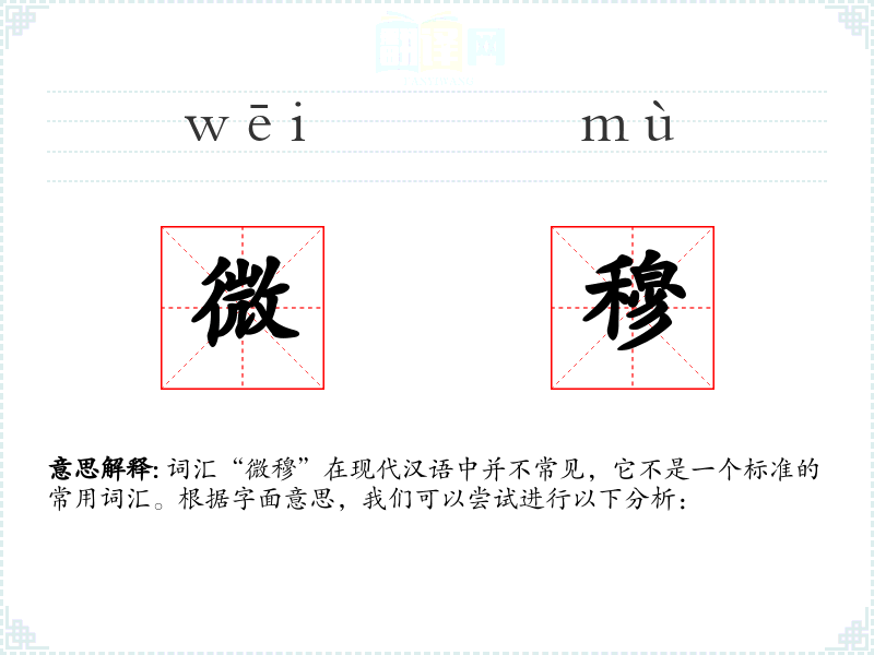 词汇“微穆”在现代汉语中并不常见,它不是一个标准的常用词汇。根据字面意思,我们可以尝试进行以下分析: