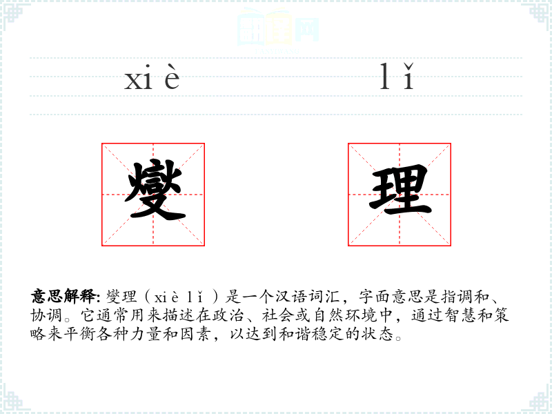 燮理(xiè lǐ)是一个汉语词汇,字面意思是指调和、协调。它通常用来描述在政治、社会或自然环境中,通过智慧和策略来平衡各种力量和因素,以达到和谐稳定的状态。