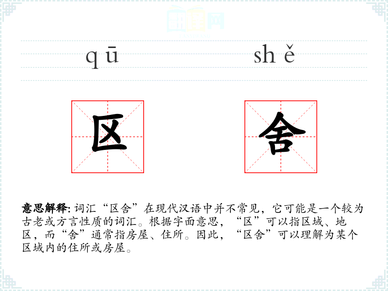 - 词源:可能源自古代汉语,其中“区”和“舍”都是古代常用的词汇。