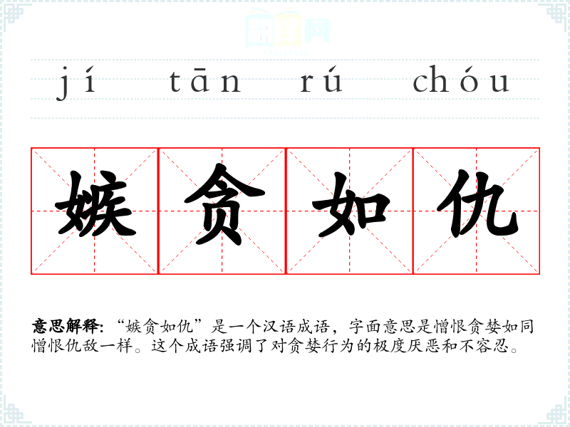 “嫉贪如仇”是一个汉语成语,字面意思是憎恨贪婪如同憎恨仇敌一样。这个成语强调了对贪婪行为的极度厌恶和不容忍。