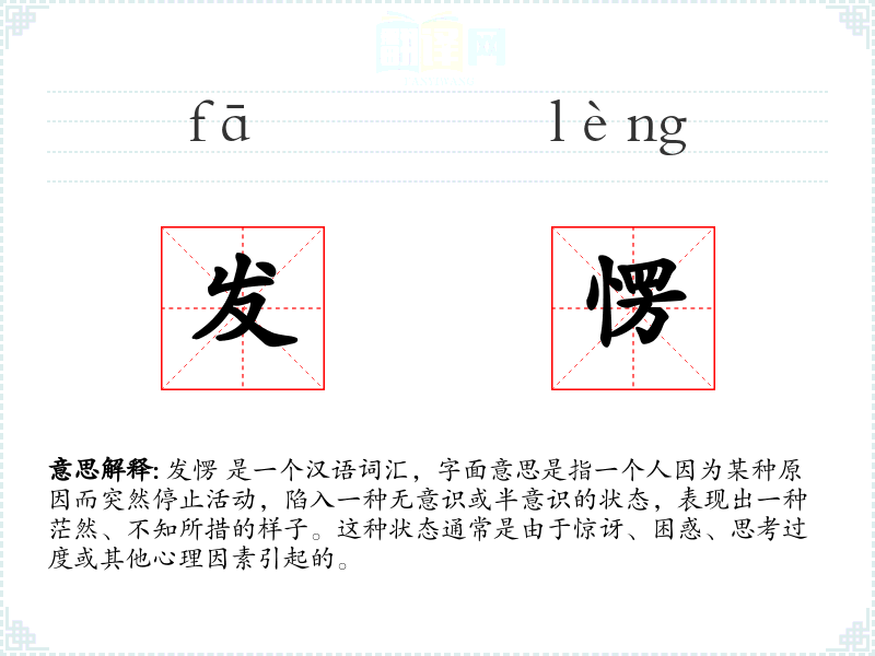 发愣 是一个汉语词汇,字面意思是指一个人因为某种原因而突然停止活动,陷入一种无意识或半意识的状态,表现出一种茫然、不知所措的样子。这种状态通常是由于惊讶、困惑、思考过度或其他心理因素引起的。