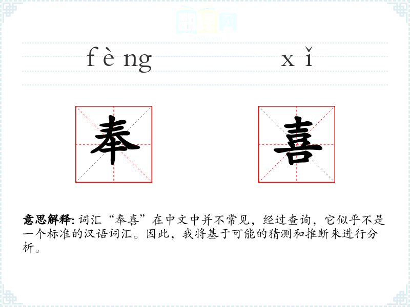 词汇“奉喜”在中文中并不常见,经过查询,它似乎不是一个标准的汉语词汇。因此,我将基于可能的猜测和推断来进行分析。
