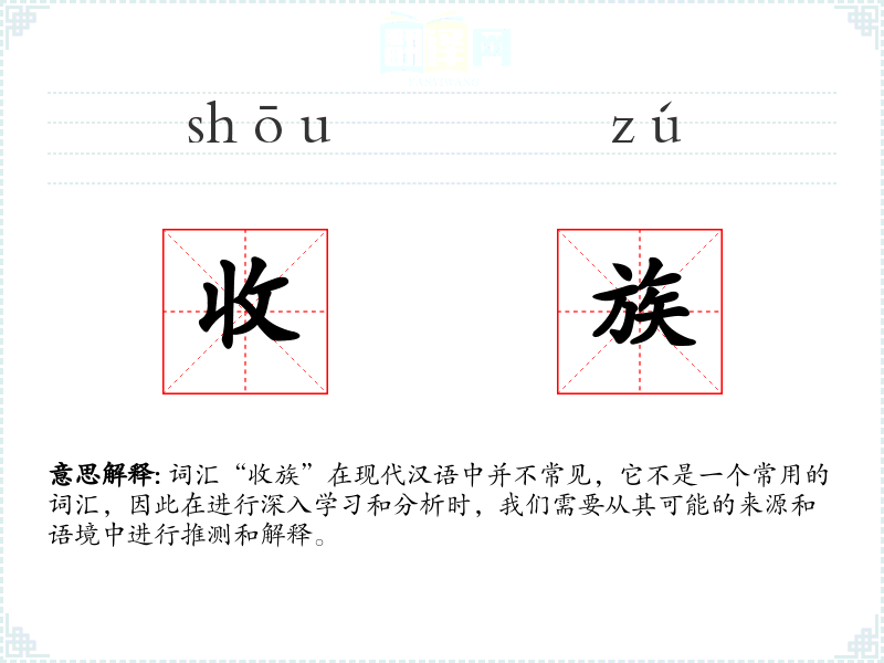 词汇“收族”在现代汉语中并不常见,它不是一个常用的词汇,因此在进行深入学*和分析时,我们需要从其可能的来源和语境中进行推测和解释。