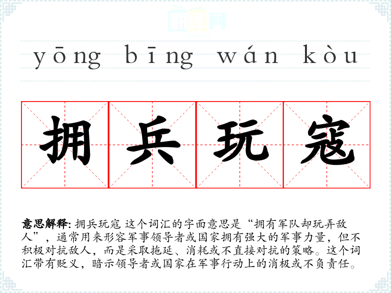 拥兵玩寇 这个词汇的字面意思是“拥有军队却玩弄敌人”,通常用来形容军事领导者或国家拥有强大的军事力量,但不积极对抗敌人,而是采取拖延、消耗或不直接对抗的策略。这个词汇带有贬义,暗示领导者或国家在军事行动上的消极或不负责任。