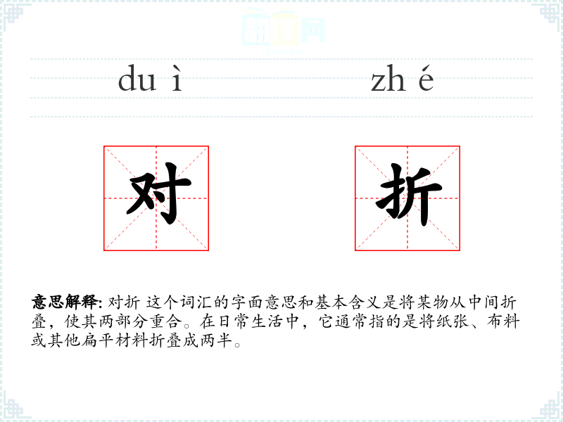 对折 的词源较为直接,由“对”和“折”两个字组成,分别表示“相对”和“弯曲”。在古代汉语中,折字已有折叠的意思,对折则是这一动作的具体化。