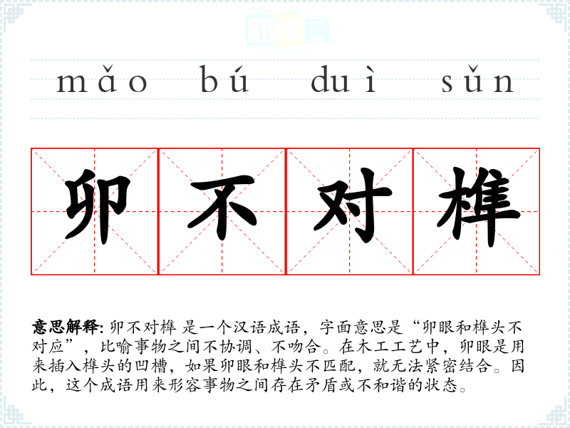 卯不对榫 是一个汉语成语,字面意思是“卯眼和榫头不对应”,比喻事物之间不协调、不吻合。在木工工艺中,卯眼是用来插入榫头的凹槽,如果卯眼和榫头不匹配,就无法紧密结合。因此,这个成语用来形容事物之间存在矛盾或不和谐的状态。
