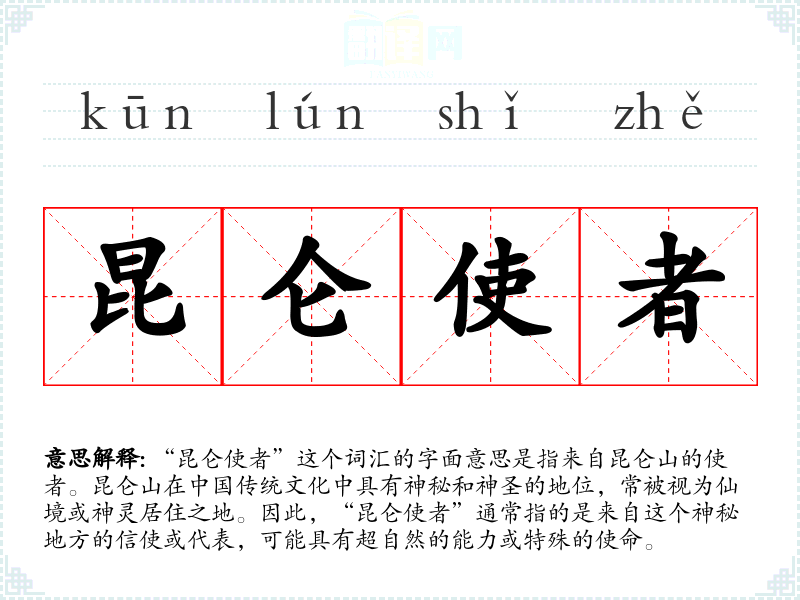 “昆仑使者”的词源可以追溯到古代神话和文学作品。昆仑山在古代文献中常被描述为神仙居住的地方,因此“昆仑使者”自然成为了传达神意或仙意的象征。随着时间的推移,这个词汇在文学和神话研究中得到了进一步的发展和应用。