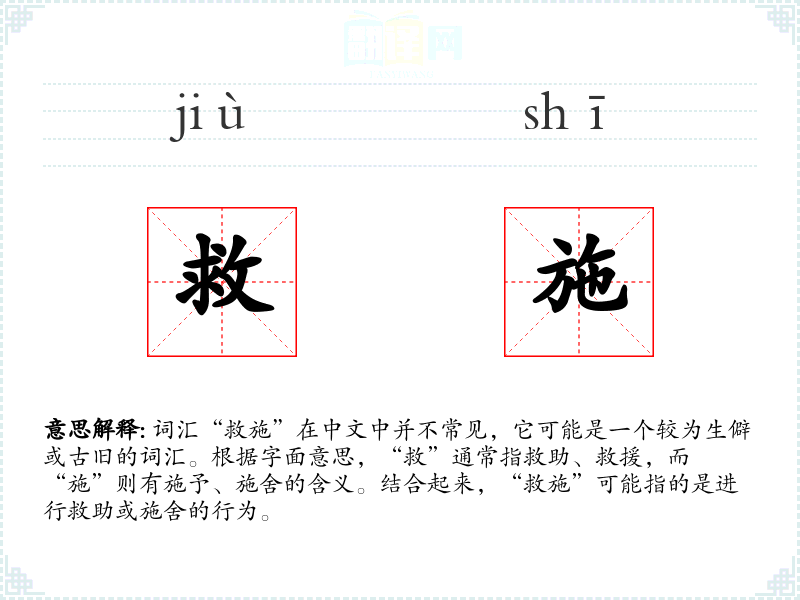词汇“救施”在中文中并不常见,它可能是一个较为生僻或古旧的词汇。根据字面意思,“救”通常指救助、救援,而“施”则有施予、施舍的含义。结合起来,“救施”可能指的是进行救助或施舍的行为。