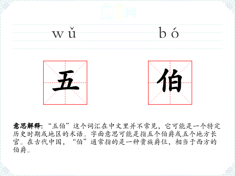 “五伯”这个词汇在中文里并不常见,它可能是一个特定历史时期或地区的术语。字面意思可能是指五个伯爵或五个地方长官。在古代中国,“伯”通常指的是一种贵族爵位,相当于西方的伯爵。