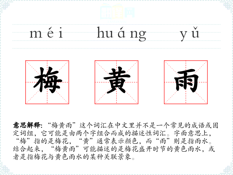 同义词:春雨、花雨(如果指的是花瓣随雨飘落的景象) 反义词:无(由于“梅黄雨”不是一个常用词汇,反义词可能不明显)