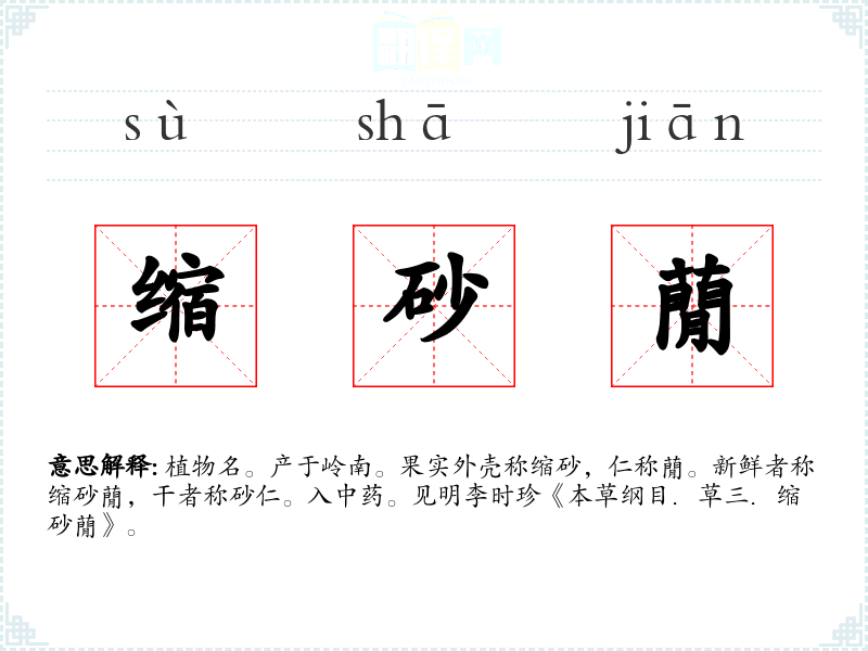 植物名。产于岭南。果实外壳称缩砂,仁称蕑。新鲜者称缩砂蕑,干者称砂仁。入中药。见明李时珍《本草纲目.草三.缩砂蕑》。