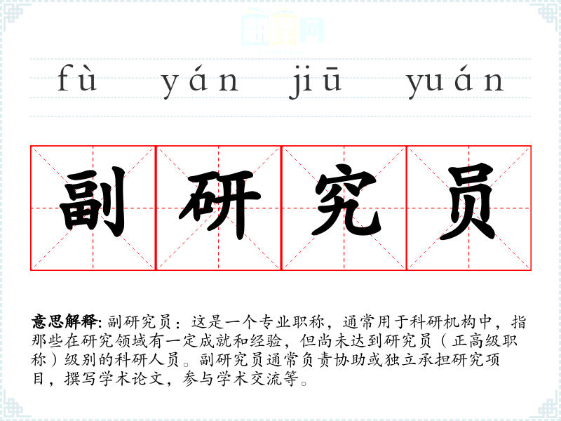 “副研究员”这个词汇直接来源于中文,其中的“副”字表示次级或辅助的含义,“研究员”则是指从事研究工作的人员。随着科研体系的发展,这个职称逐渐标准化,并在不同的科研机构中得到广泛应用。