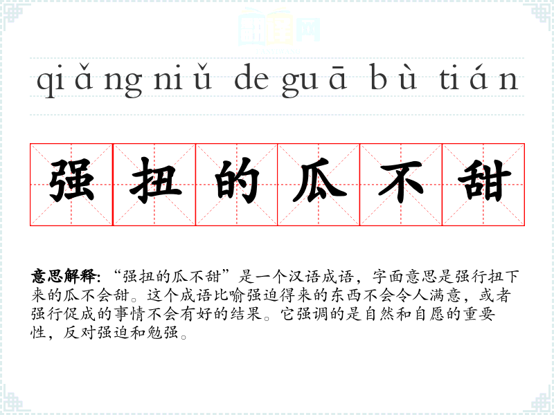 - 勉强:指不情愿地做某事,与“强扭的瓜不甜”有相似的含义,但更侧重于内心的不情愿。