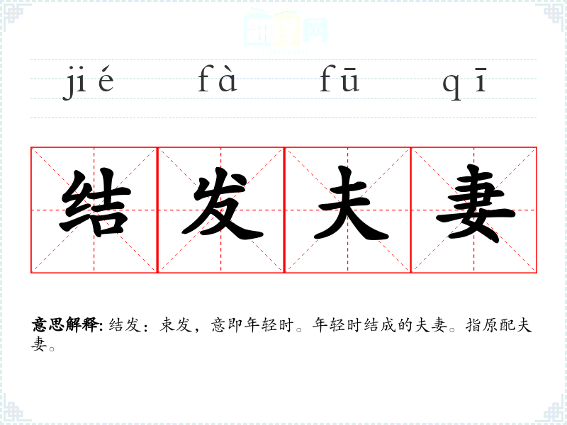 结发:束发,意即年轻时。年轻时结成的夫妻。指原配夫妻。